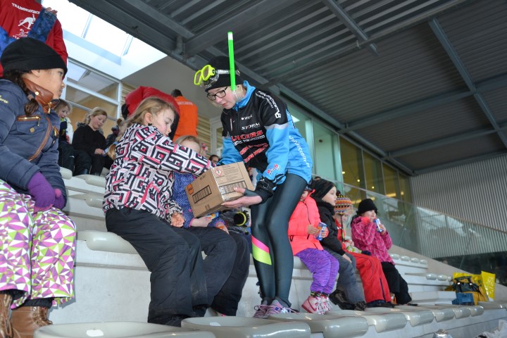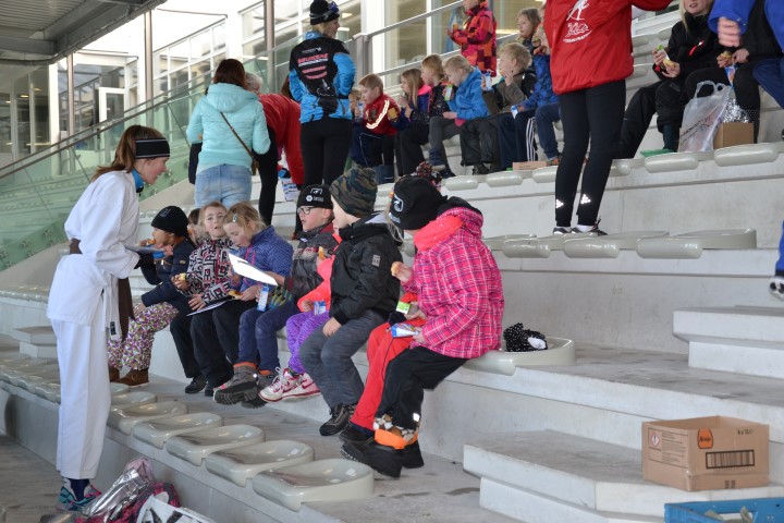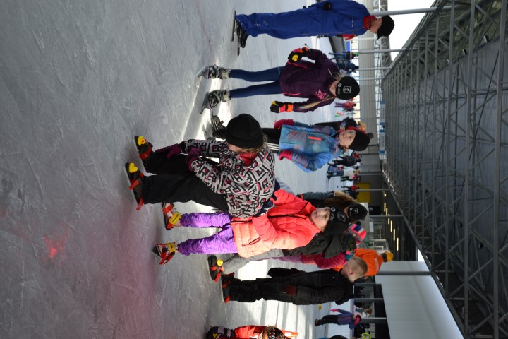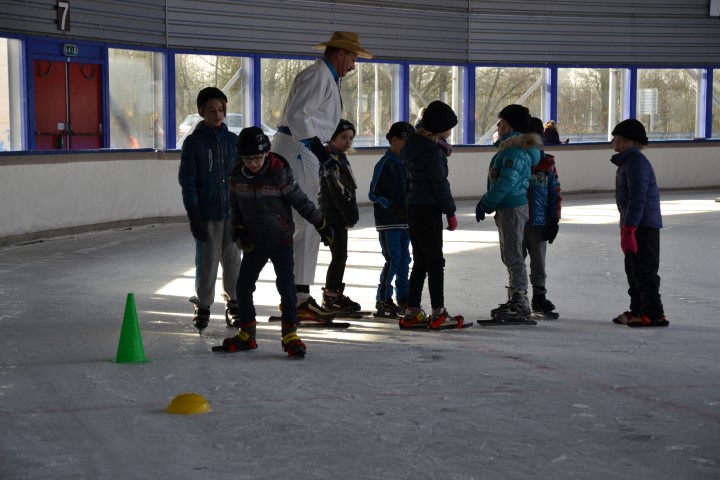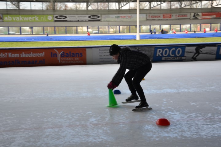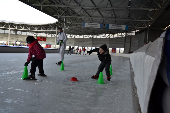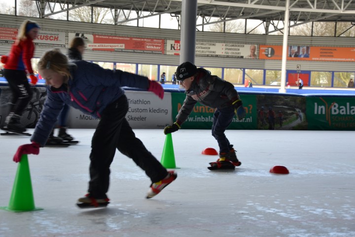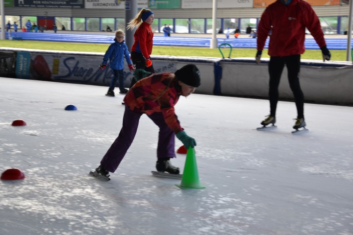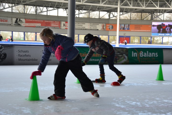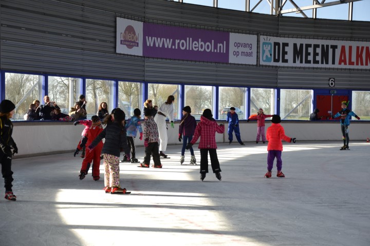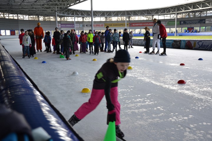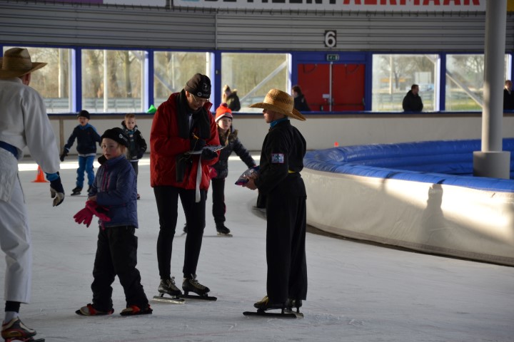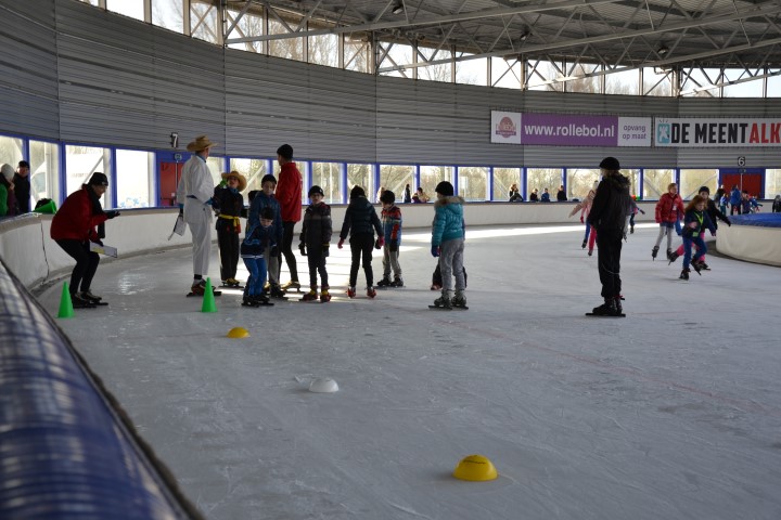 Er waren zes kinderen, die nog wilden tijd rijden en zeven, die ronden wilden rijden. De stopwatch er maar bij en zo hard mogelijk schaatsen over het uitgezette baantje. Dat ging heel vlot. Inmiddels waren de inhalers aan hun rondjes begonnen en net als de andere kinderen die hun rondjes al hadden gereden, kregen ook zij spekjes voor de nodige energie en elk rondje werd genoteerd. Ze mochten doorgaan tot ze er genoeg van hadden. De kleinsten mochten na een paar grote ronden de mini rondjes doen, ook tot ze het zat waren want dan konden ze gewoon aanschuiven bij de spelletjes.