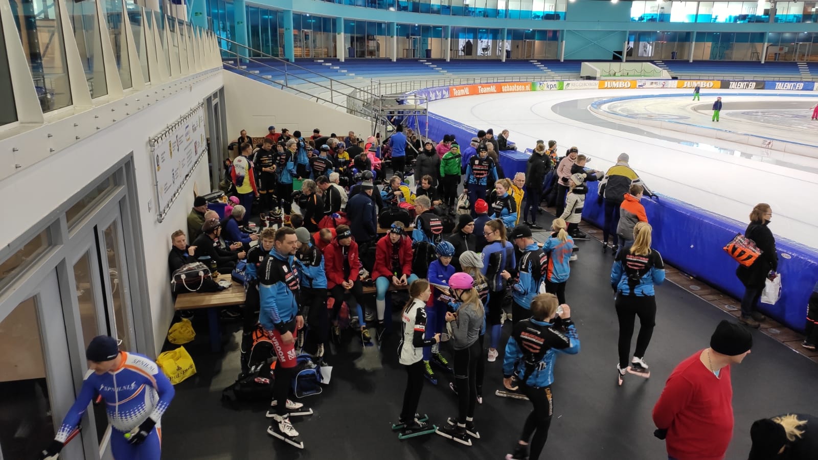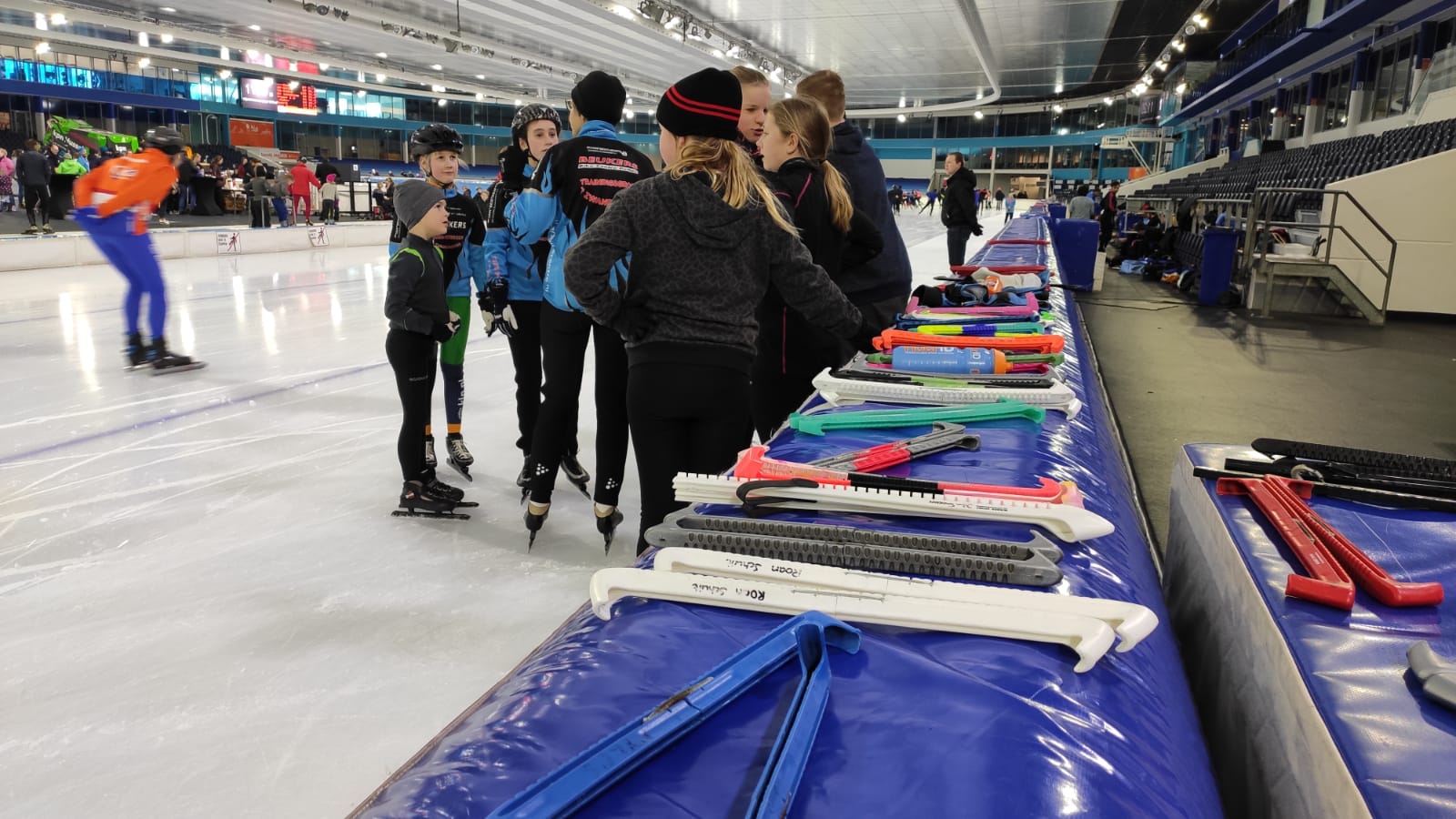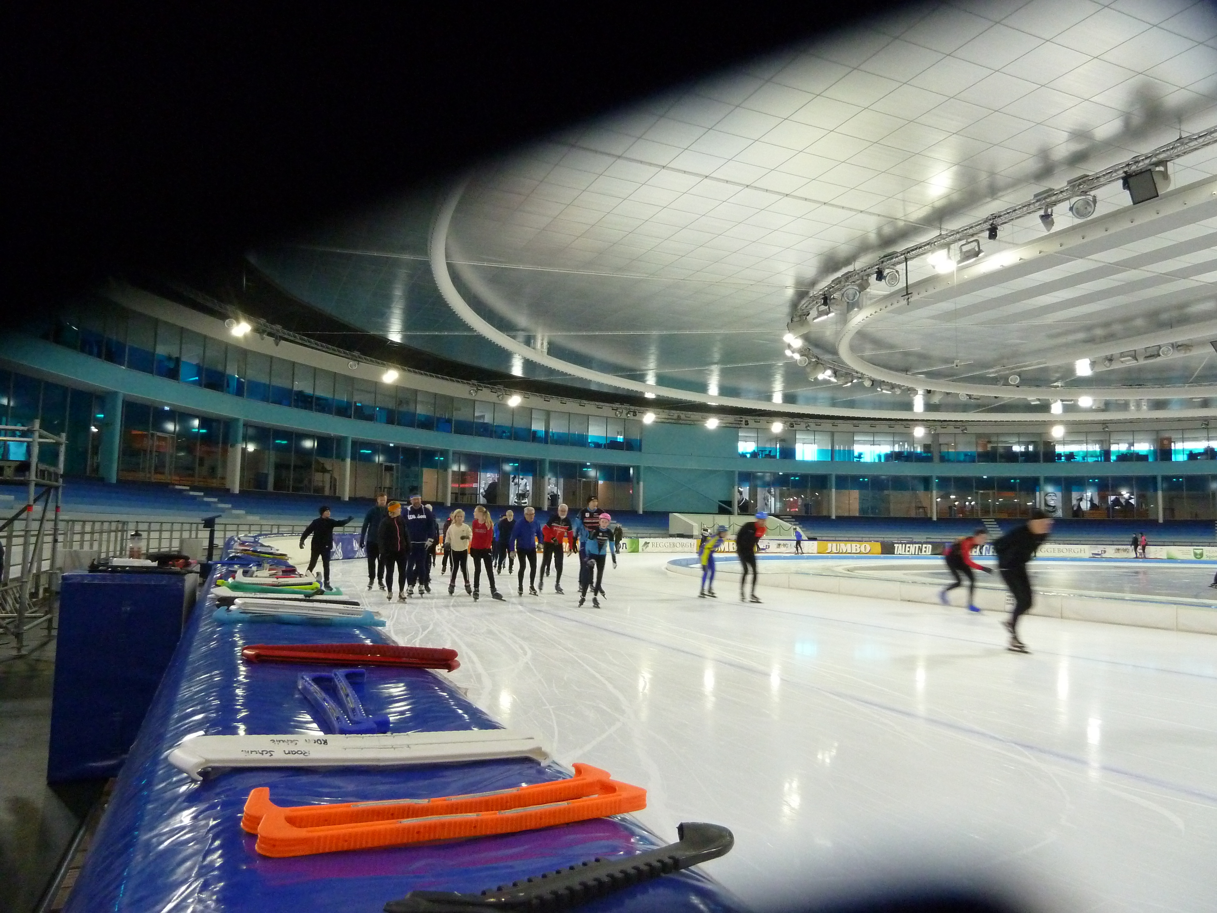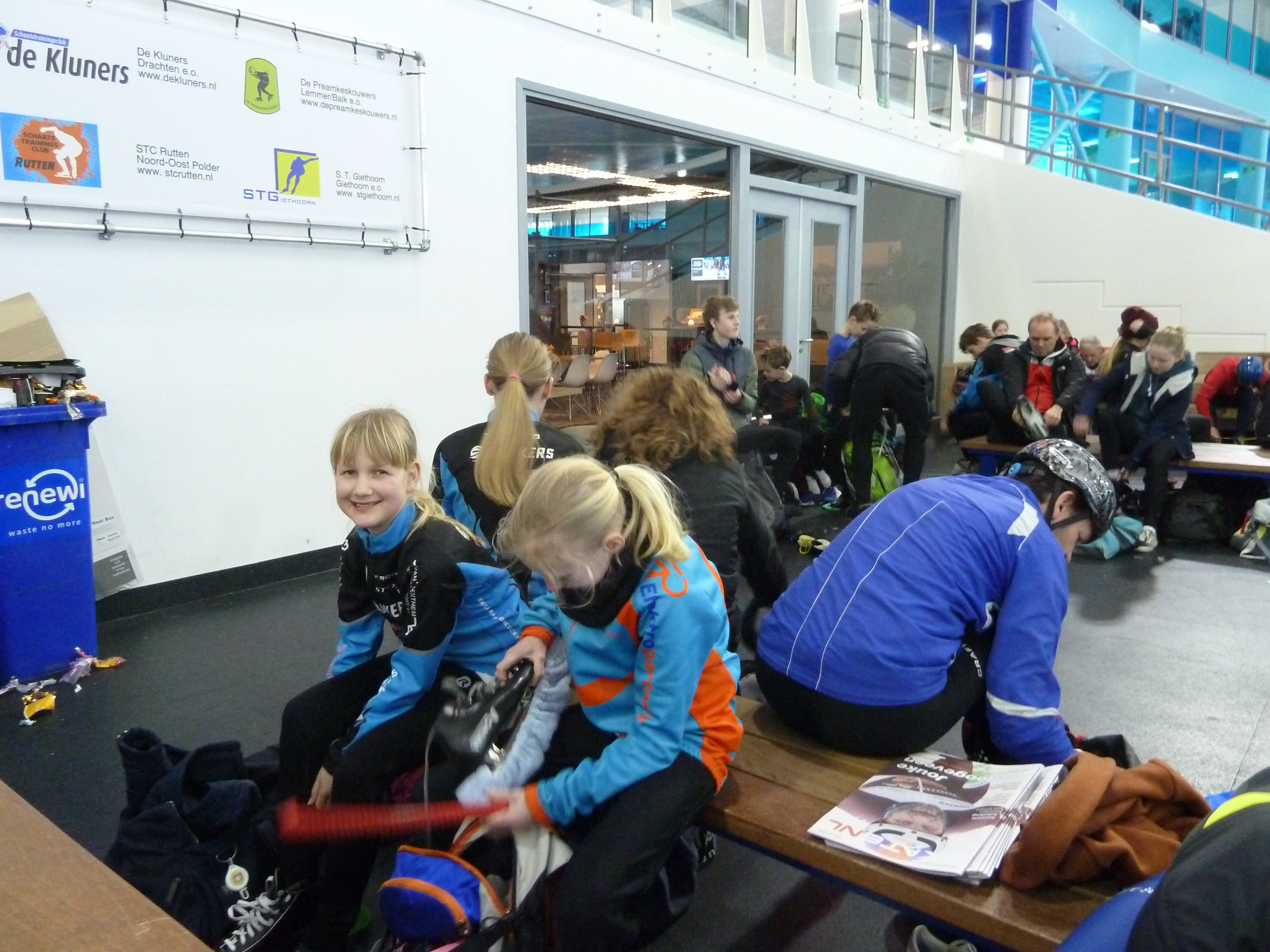 De snelle jongens probeerden een recordronde te rijden en bij de tweede poging werd dat 29,9! De eerste dweilpauze was om 11.00 uur. Tijdens de dweil hielden we ‘koek en zopie’ om daarna weer energie te hebben voor het volgende uur. Er werd volop geschaatst: veel rondjes rijden of juist heel goed oefenen op de bochten. Natuurlijk ging het ook om de gezelligheid, dus er werd heel wat afgekletst! Na de tweede dweilpauze hadden we nog drie kwartier en de meesten gebruikten hun tijd volledig, ook al voelden ze hun voeten, rug of spieren. Je hebt tenslotte niet elke dag de gelegenheid om op deze prachtige baan te rijden. Om half twee stapten we weer in de bus en keerden we zeer voldaan huiswaarts. Het was een zeer geslaagd uitje!