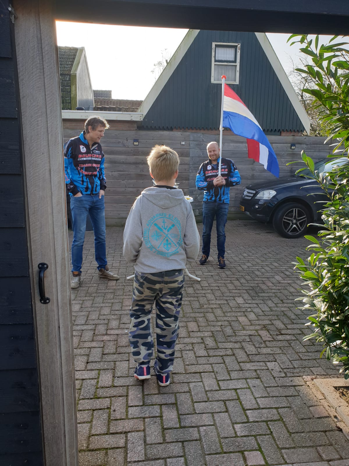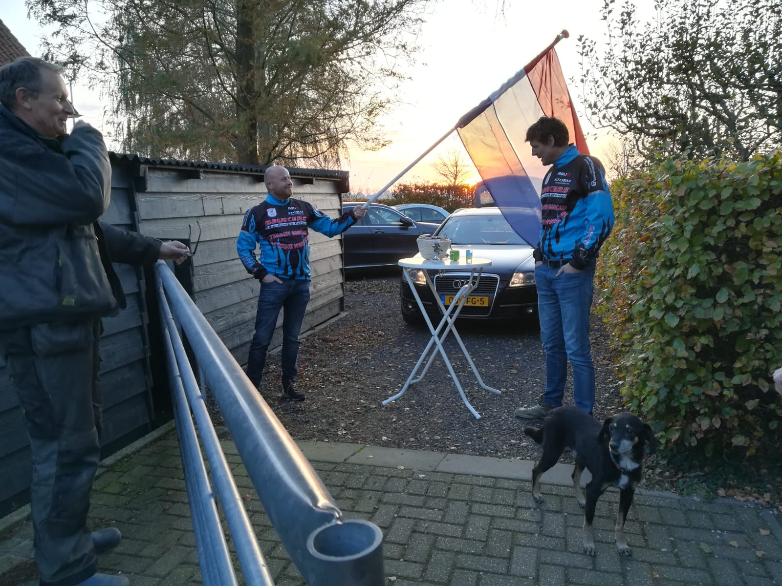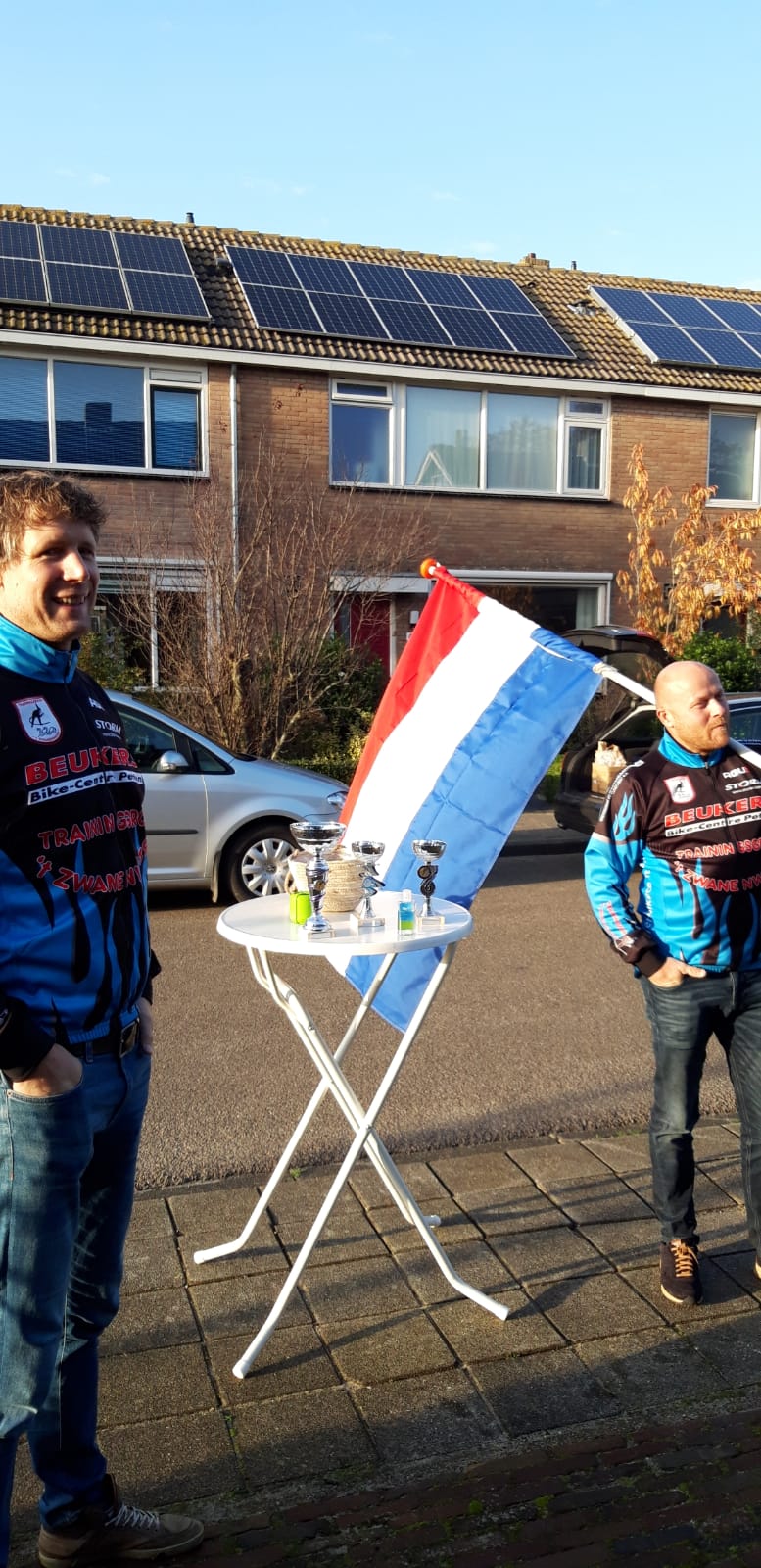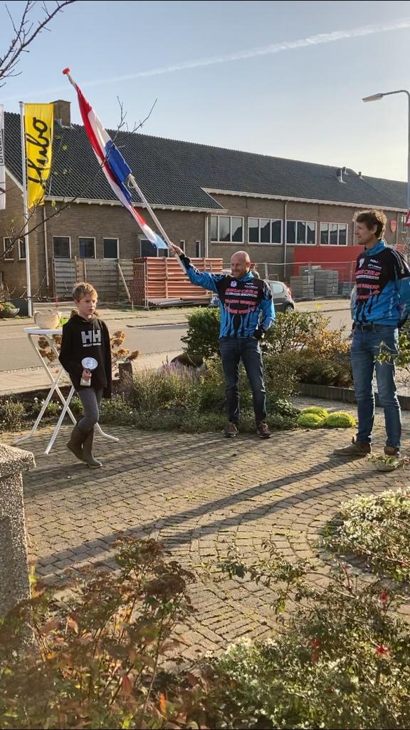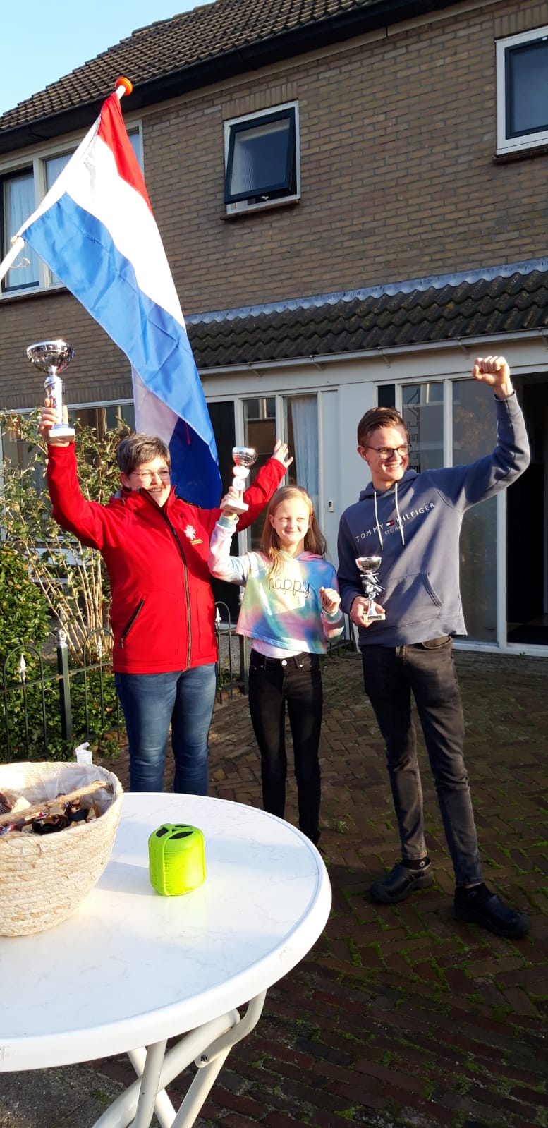 In eerdere berichten schreven we al dat het goed zou komen met de uitreiking van de prijzen en het kwam goed. Op zondag 8 november reden Joost en Ronald met een auto vol prijzen langs de winnaars elk afzonderlijk. Bij het adres aangekomen, werd er een statafel neergezet met de prijs er op. Vervolgens werd de vlag opgestoken en het Wilhelmus ten gehore gebracht. De prijswinnaar mocht daarna zelf de prijs pakken. Alles op ruime afstand, handgel binnen bereik en in de buitenlucht.