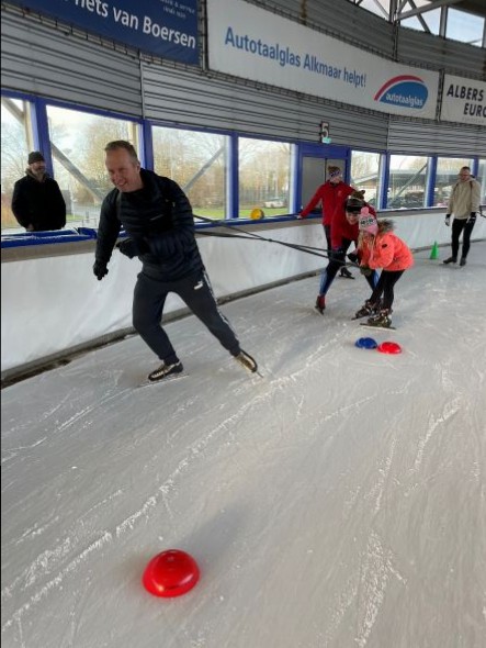 Voor sommige gastrijders was het de eerste keer dit seizoen om op het ijs te staan. Na eerst wat onwennige streken voelde het snel al meer vertrouwd. De kinderen hielpen ze en gaven aanwijzingen bij lastige oefeningen. De ouders werden ook ingeschakeld, om hun kind vast te houden bij het bocht lopen. Dat ging heel goed. Konden de ouders ook al zo goed starten als de kinderen? Dat moesten ze natuurlijk bewijzen. Ze startten met hun kind. Poeh, nog best lastig, maar ze lieten zich niet kennen! Bij de estafette waren ze net zo enthousiast (en fanatiek) als de kinderen.