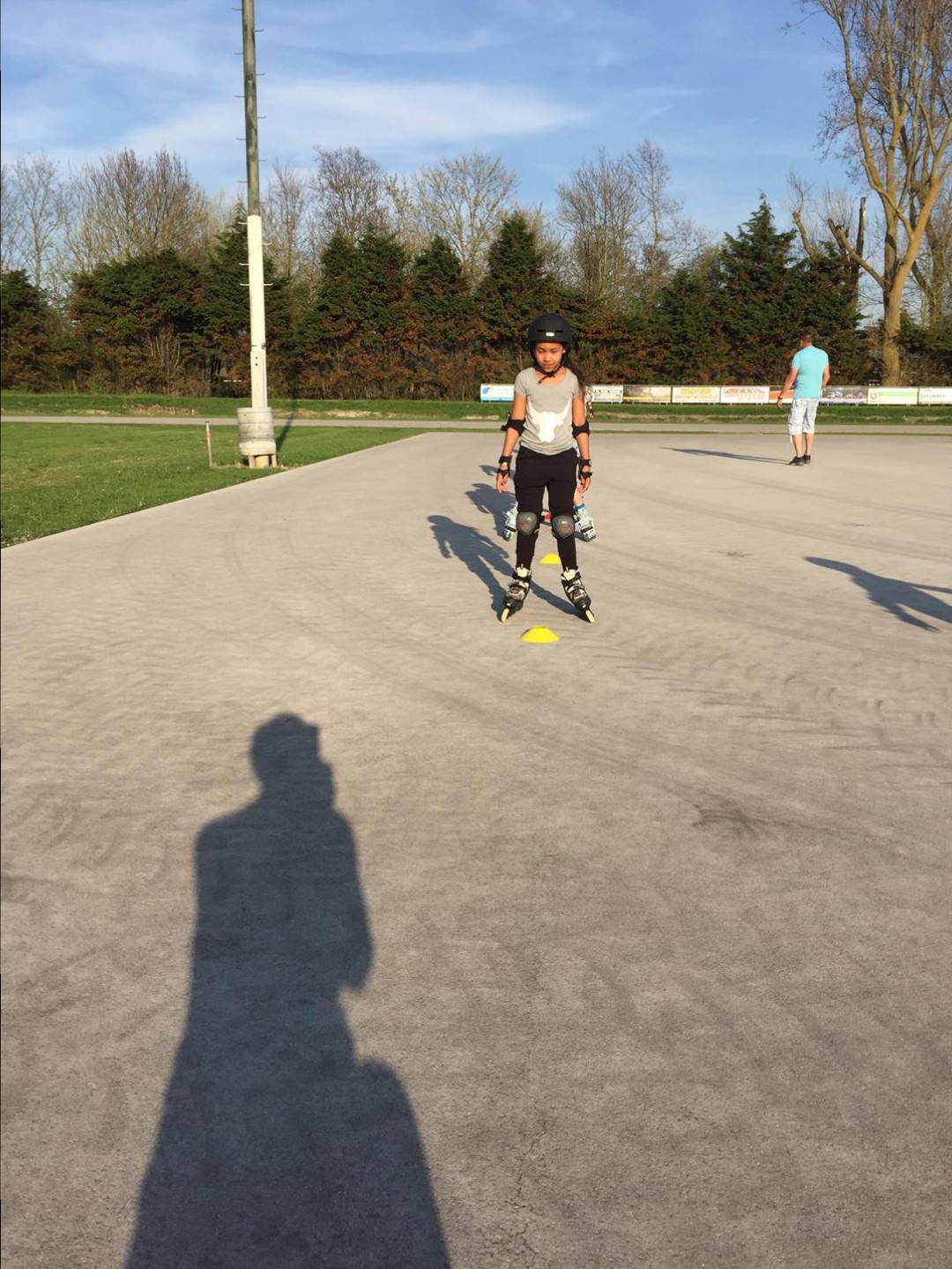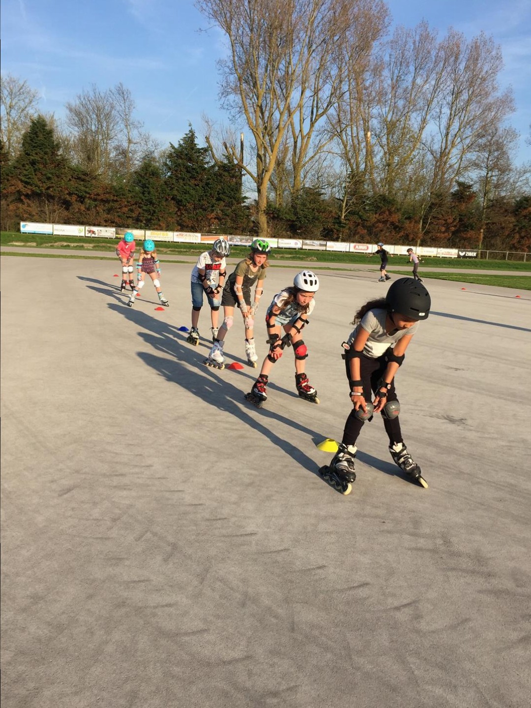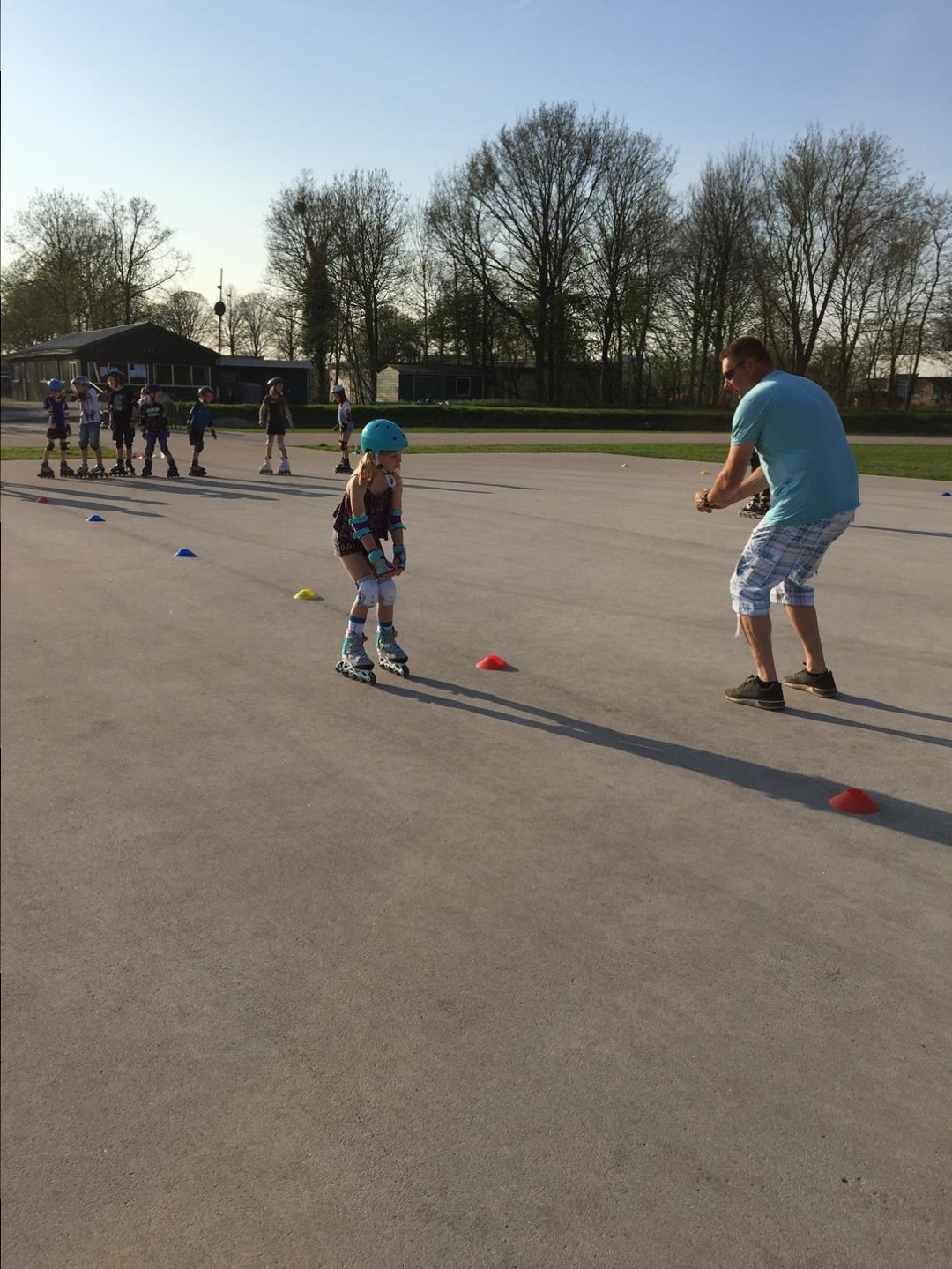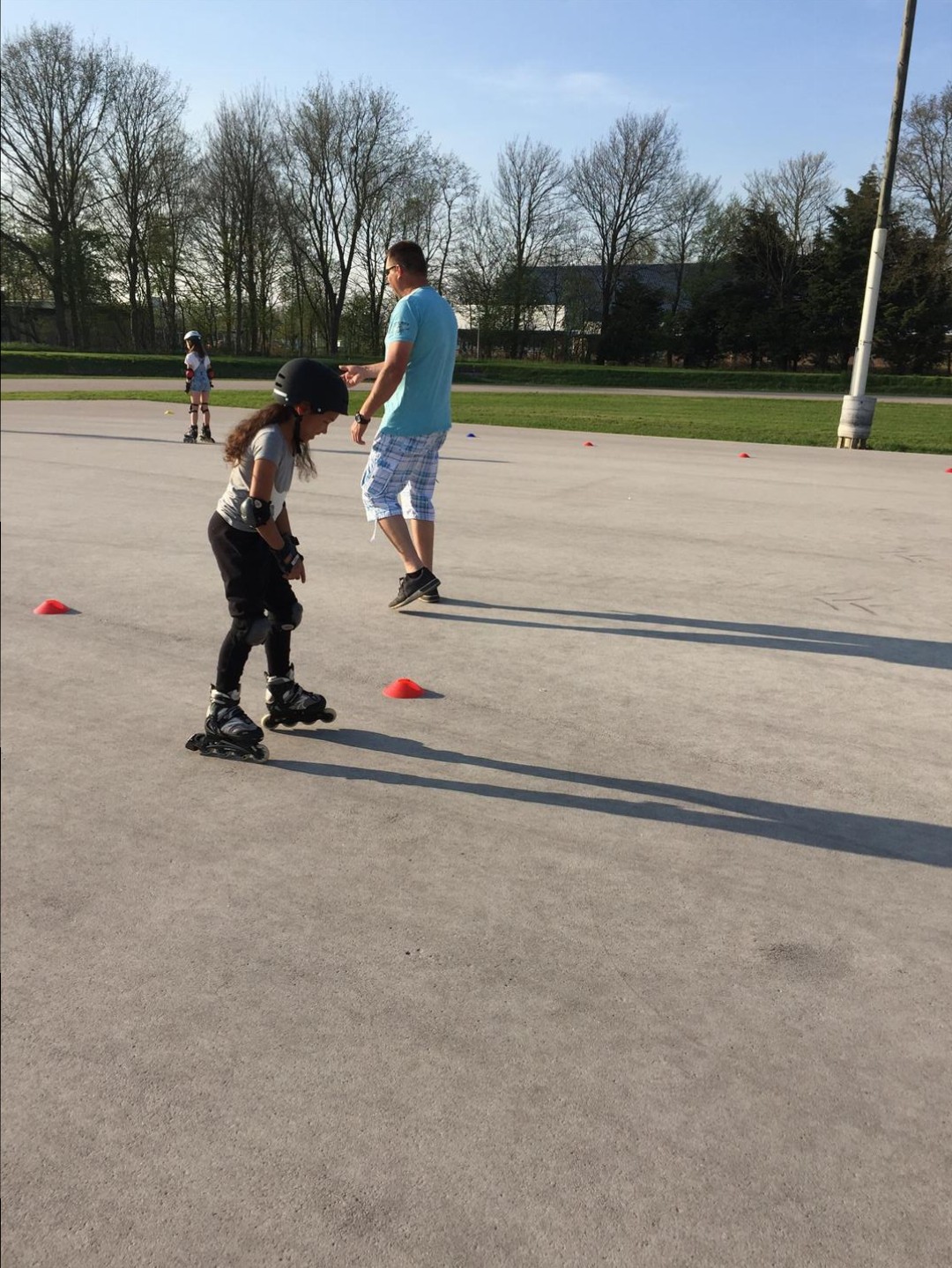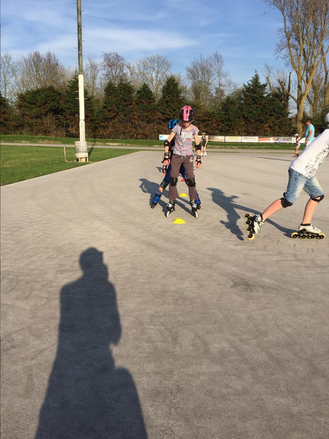 Het was wel weer even wennen voor iedereen, maar voor degene met nieuwe skeelers nog extra. Eerst oefenen met remmen, want dat is een essentieel onderdeel van het skeeleren.  Na enkele opbouwende oefeningen, kregen ze de slag te pakken.