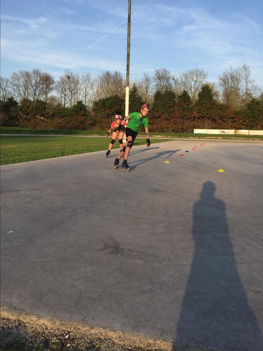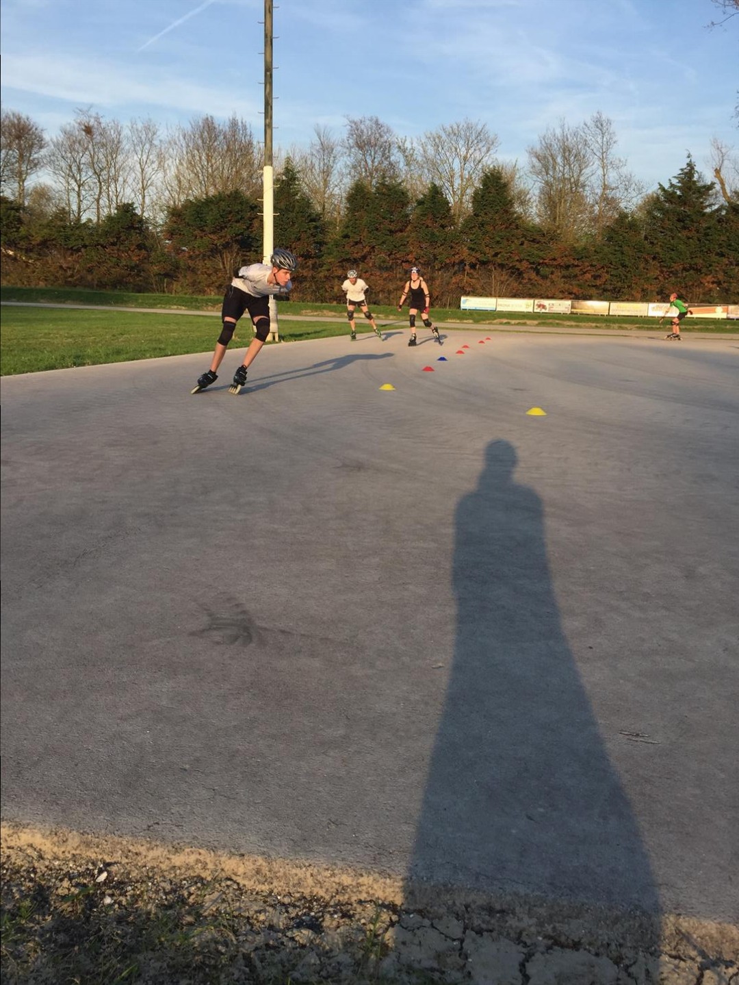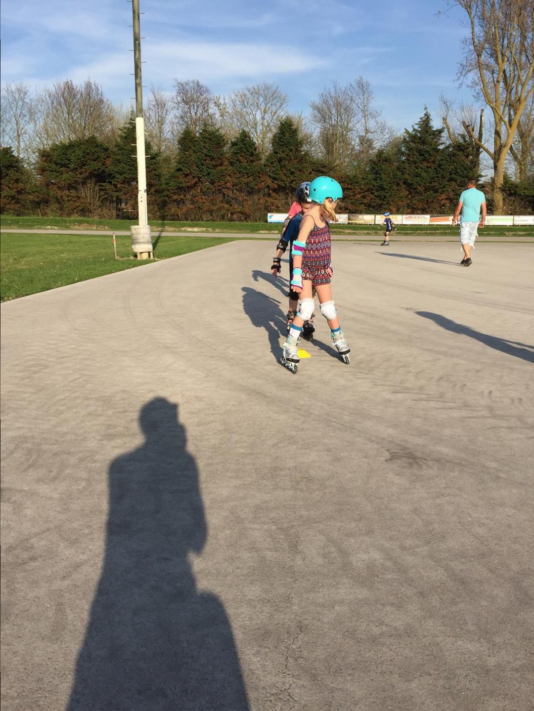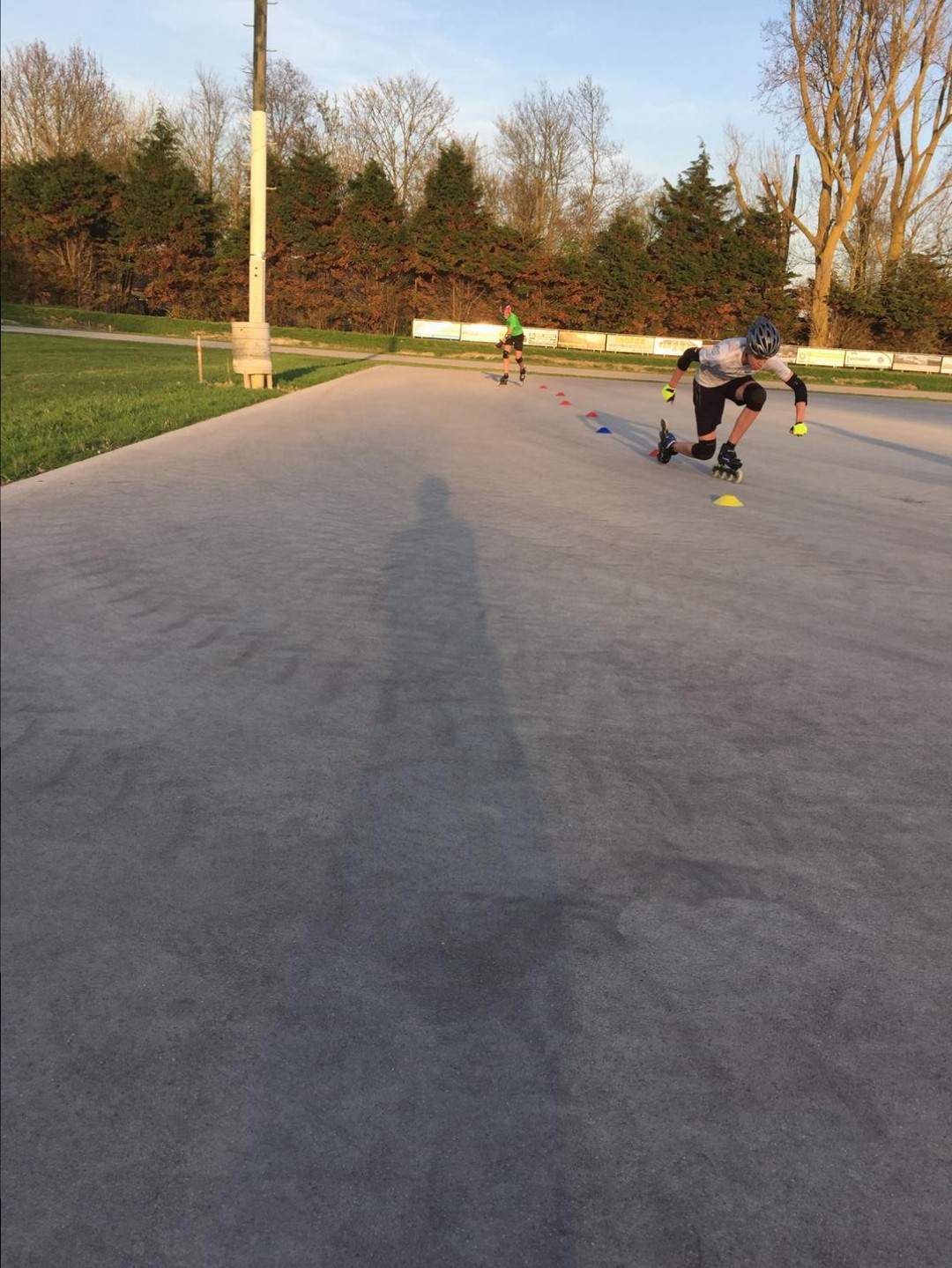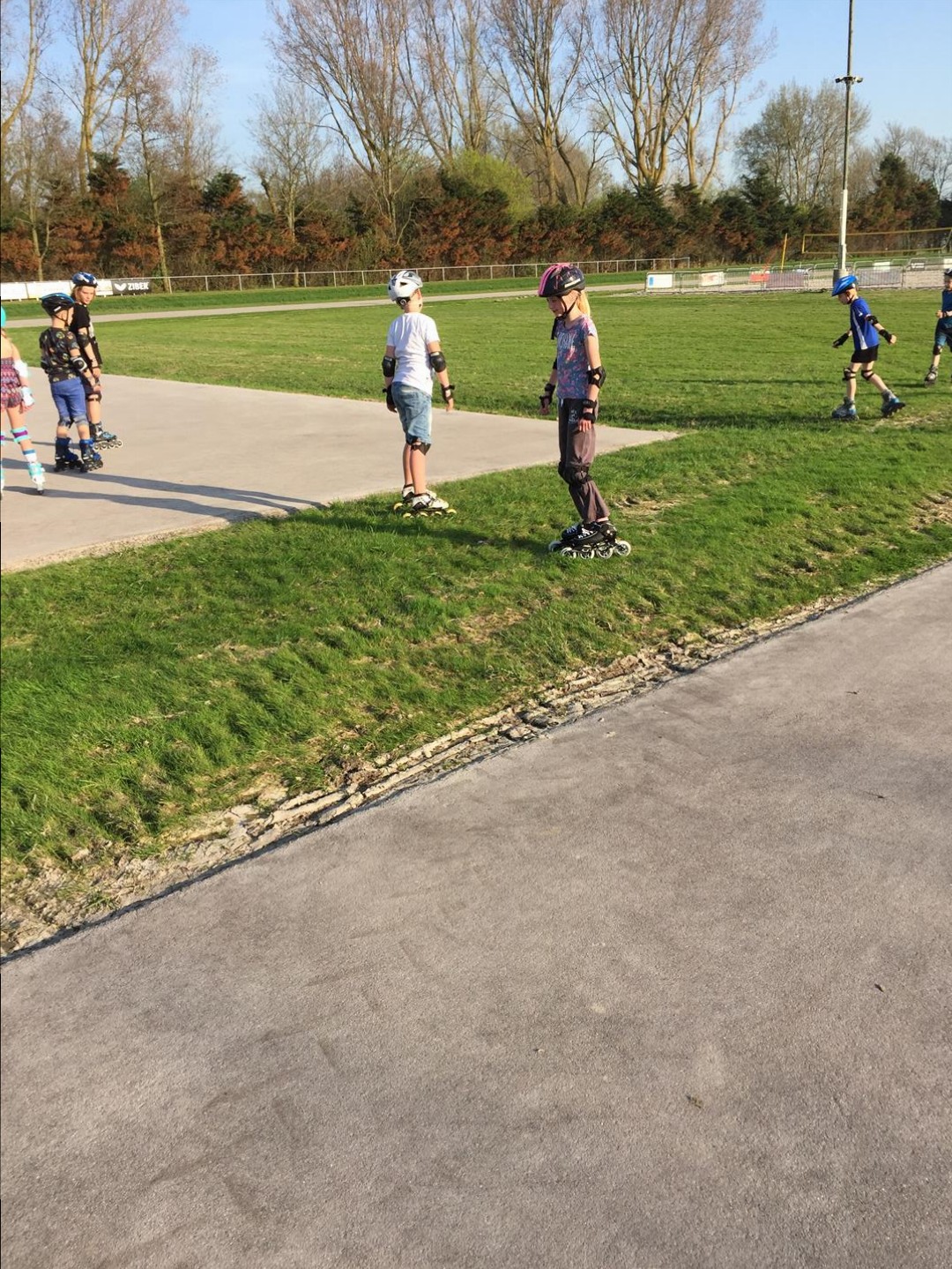 Donderdag 19 april, de warmste lentedag ooit, was de eerste skeelertraining. De deelnemers hadden er toch  zin en waren voorbereid: zeer luchtige kleding, maar wel met bescherming en een rij bidons met water langs de kant. Met een extra drinkpauze, hielden ze het goed vol. De weerberichten geven aan, dat het volgende week weer 12 graden zal zijn!!!!!!!!
