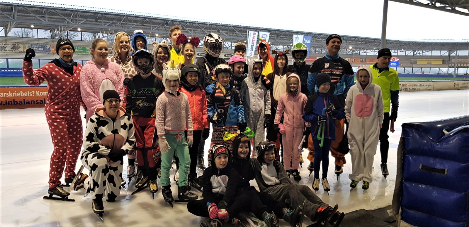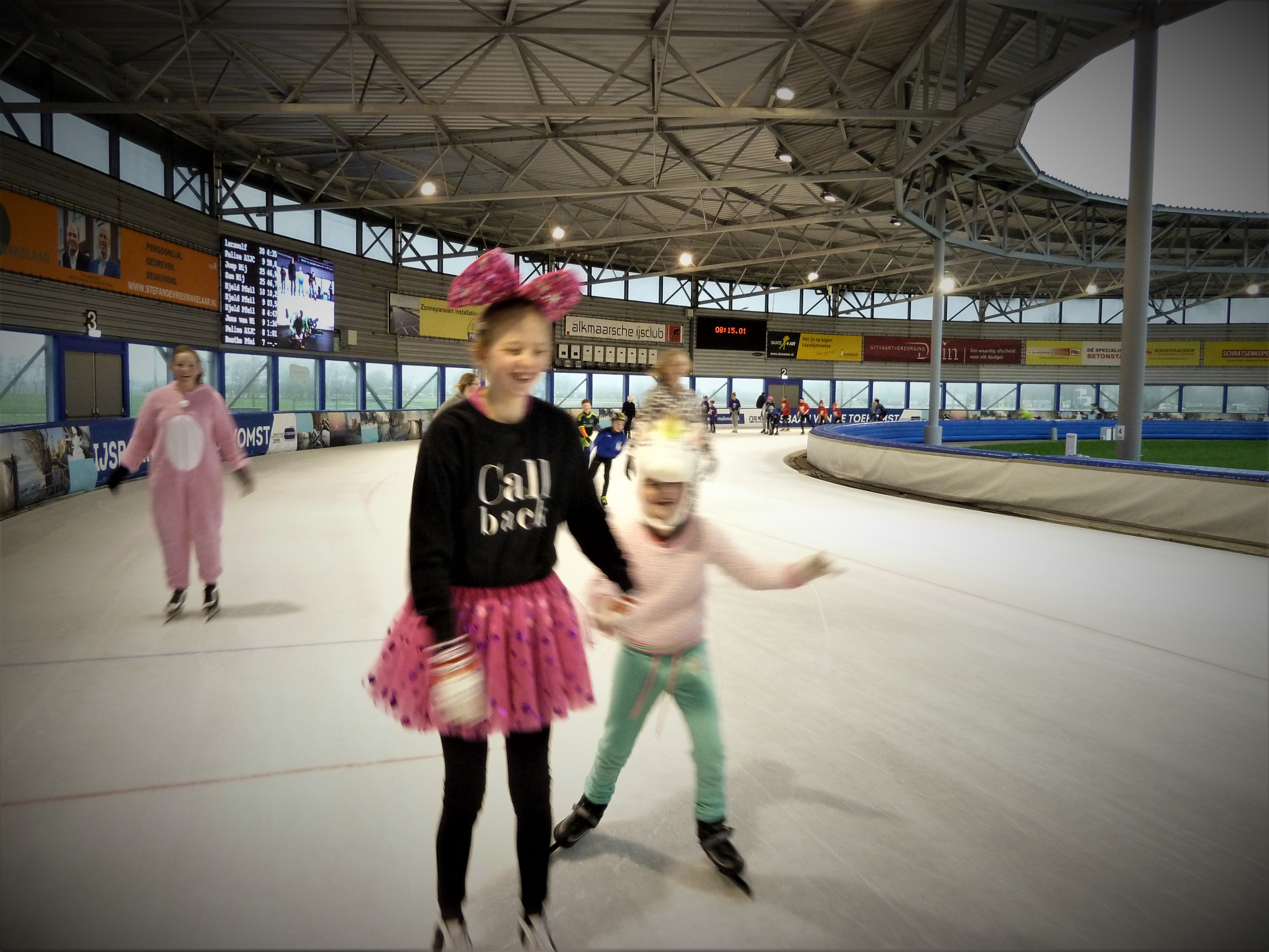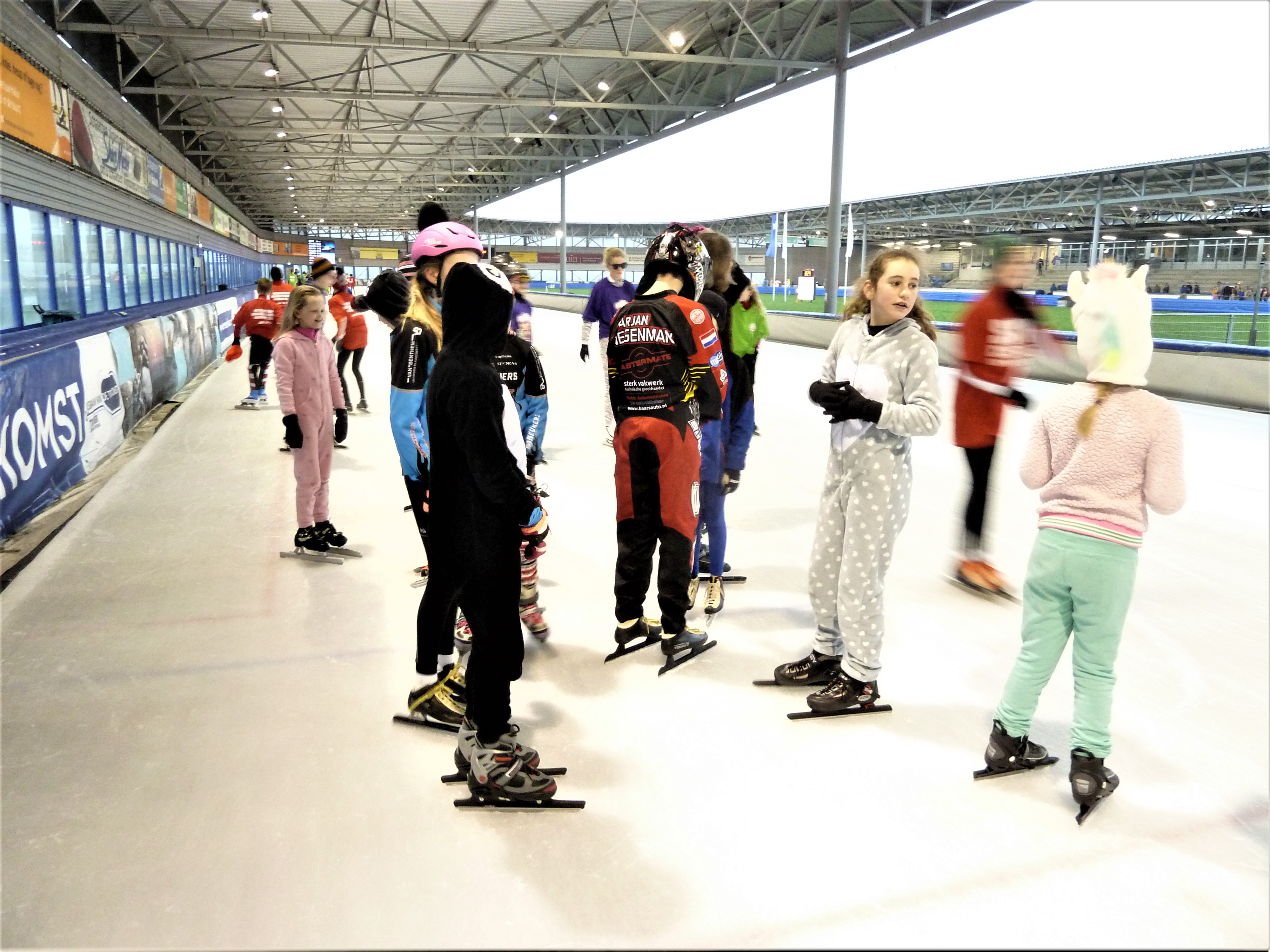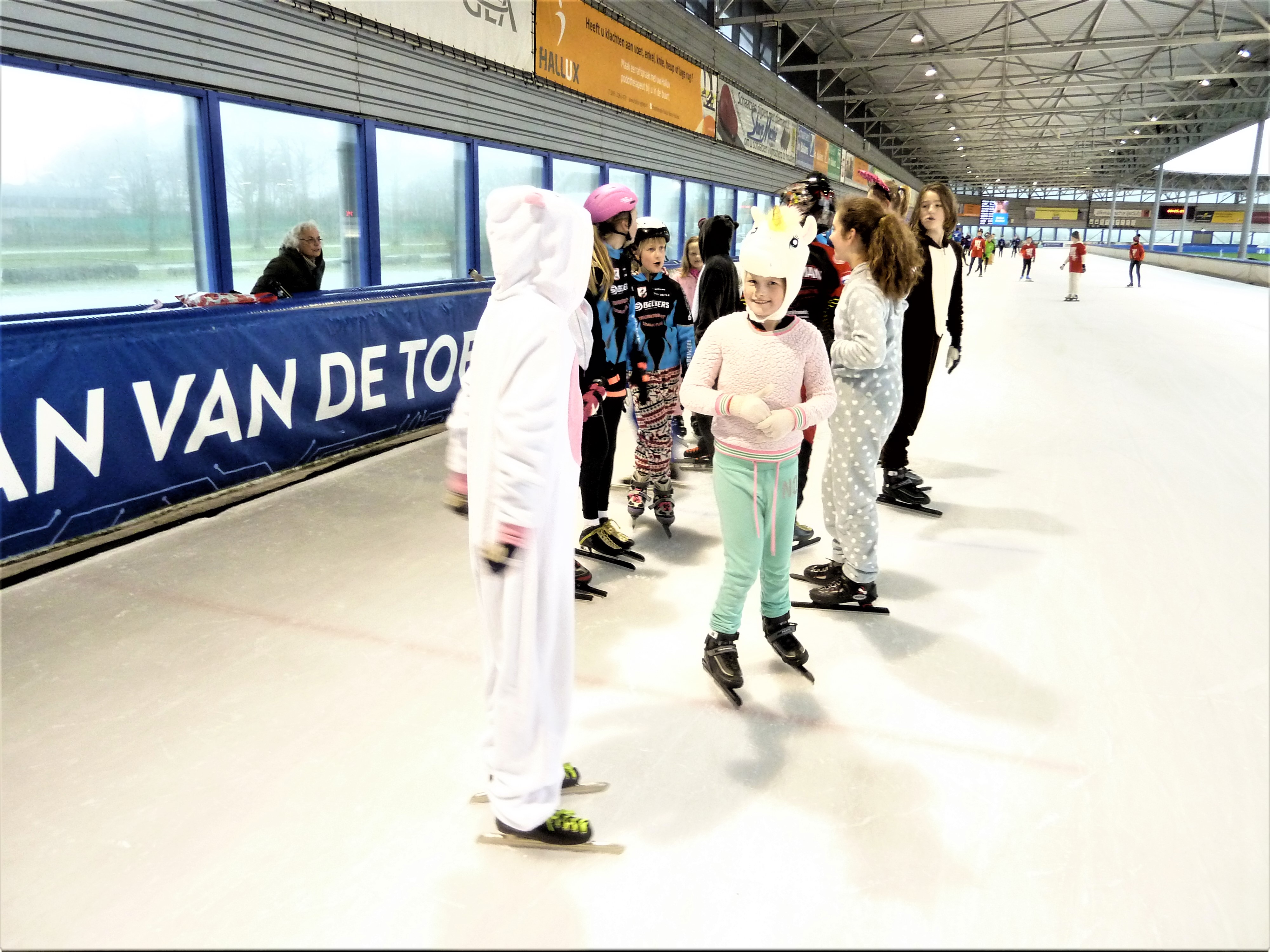 Zaterdag 16 maart was echt de allerlaatste les van het seizoen. Het zag er heel kleurig uit, want vele schaatsers waren verkleed. De trainingen verliepen anders dan anders. Al bij het inlopen deden we tikkertje op verzoek van een pupil. Er werden spelletjes gedaan of niet alledaagse oefeningen. Zo moest er geschaatst worden, zonder de schaatsen van het ijs te tillen of omgedraaid starten.