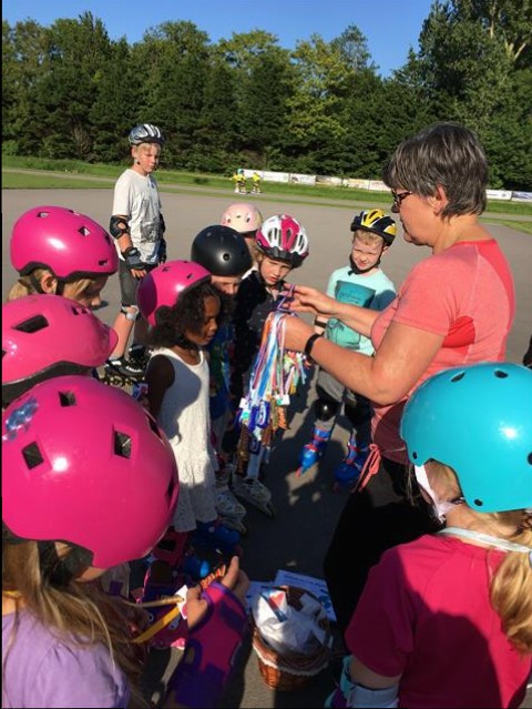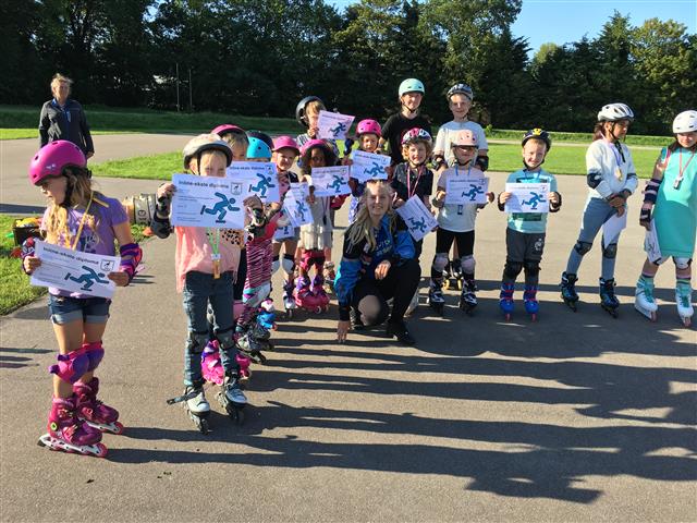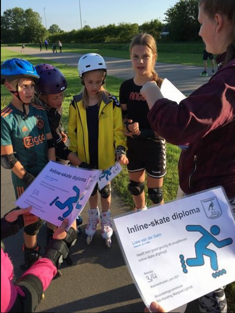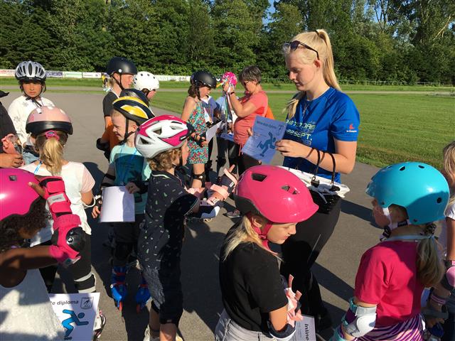 Donderdag 23 juni was alweer de laatste les van de 10 skeelerlessen voor jeugd van 6 t/m 12 jaar. Sommige kinderen begonnen wat voorzichtig, maar door de oefeningetjes en spelletjes, voelden ze zich snel vertrouwd. Door een pittenzakje op te halen,  te keren om een pion en vlug weer terug, onder een ‘brug’ door te skeeleren, te slalommen om pionnen en nog veel meer oefenvariaties te doen, werden ze steeds behendiger. Het plezier spatte er van af.
