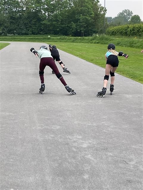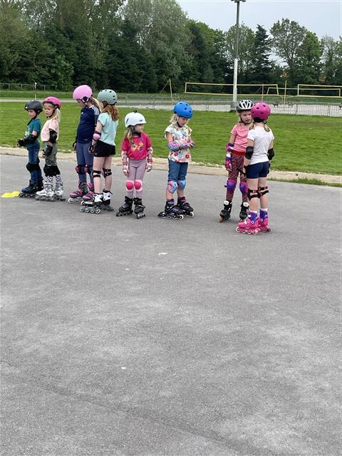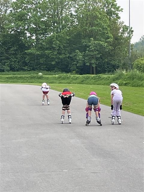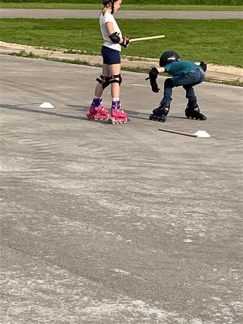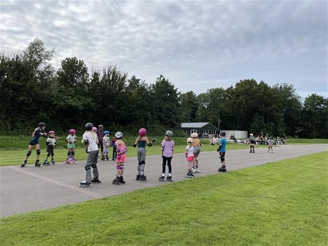 Maandag 8 juli was alweer de laatste les van de 8 skeelerlessen. De kinderen hadden er zin in, want er stonden allerlei spelletjes op het programma. Eerst de estafette over de hele ronde en dat is best een lange afstand. Zelfs de kleinste kinderen gingen de uitdaging aan. Met een trotse blik skeelerden ze langs de ouders, die ze vol enthousiasme aanmoedigden. Ze speelden voetbal met een grote bal, deden een spel met kaarten verzamelen en moesten pittenzakken ophalen die over de hele baan verspreid lagen. Als laatste en hoogtepunt waar ze naar uitgekeken hadden: gooien met de waterballen! Wat een pret!